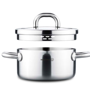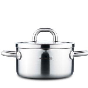 La línea Alba de Korkmaz ofrece la pureza del acero inoxidable 18/10 con un diseño práctico que optimiza cada preparación. Su tapa con colador integrado y su base de distribución homogénea de calor te permiten cocinar y escurrir de manera más rápida y eficiente.